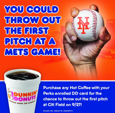 Throughout August, Dunkin’ Donuts is hosting the “First Cup, First Pitch” sweepstakes, where guests can enter to win the chance to throw out the first pitch at a New York Mets game in September.