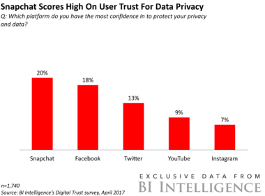 According to a Business Insider Intelligence’s 2017 Digital Trust survey, Snapchat is the most trusted app in terms of personal data protection and privacy. For brands, this has multiple implications. First, it indicates that they should be careful about where they place their ad dollars as consumers become more wary about the platforms they use. Second, its shows which platforms users feel the most at ease, and thus where they are more willing to make and participate in genuine interactions. Third, and finally, it highlights the platforms in which brands have an opportunity to connect with its consumers on a deeper, more meaningful level in the absence of security and privacy concerns.