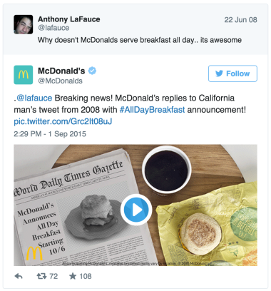 McDonald’s went back as far as 2006 and found tweets from people hankering for all-day breakfast. They created GIFs and other elements to reply to more than 20 of them and let them know their social media requests were being answered.