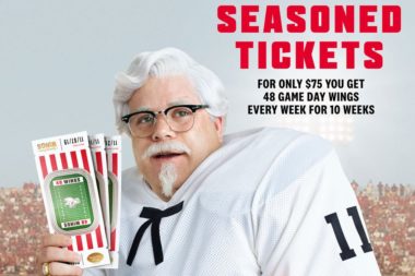 Starting Thursday, KFC will sell up to 500 of its $75 “Seasoned Tickets” on StubHub. The passes give each buyer a weekly order of 48 KFC chicken wings for nine weeks, and a final order of 96 wings in the 10th week. KFC is promoting the deal in conjunction with its latest football-themed spots, and positioning it as an, “unbeatable game day delivery offer.” KFC’s out of the box collaboration with StubHub is an interesting way to stand out in an increasingly competitive fried chicken category.