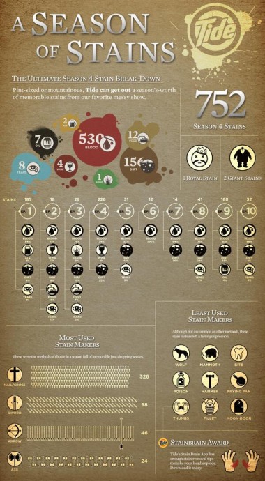 This week, Tide has leveraged Twitter’s two-month-old pinned tweet feature to highlight a fun infographic showing how often different kinds of stains appeared in Season Four of “Game of Thrones.”