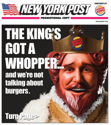 Burger King is taking out full-page cover ads Tuesday featuring its king character to promote its new Grilled Dogs. The latest addition to the chain’s permanent lineup was announced earlier this month and officially launches Feb. 23. Burger King plans to cover the NY Post, NY Daily News, Chicago RedEye, Metro Philly, San Francisco Examiner, Houston Chronicle and Express DC with its advertising. The text next to the king character reads: “THE KING’S GOT A WHOPPER… and we’re not talking about burgers.”