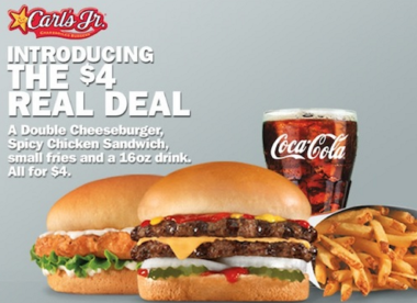 Burger chains continue their wheeling and meal-dealing. Carl’s Jr. has upped the ante on what $4 gets you in a bundled value meal. Their Real Deal includes a Double Cheeseburger plus a Spicy Chicken Sandwich, small fries and a drink.