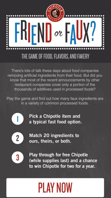 To play “Friend or Faux,” participants pick one Chipotle menu item and one fast-food menu item, including “burgers, burritos, tacos, sandwiches, salads and pizzas available from a number of common fast food brands.” Then, players are presented with a list of 20 ingredients. Participants identify which menu item contains each ingredient – Chipotle, the fast-food chain, or both.