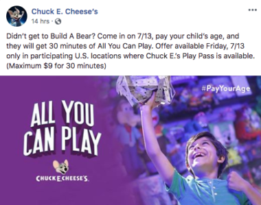 In a move that plays off the success and subsequent failure of Build-A-Bear’s “Pay Your Age Day” promotion, Chuck E. Cheese’s is now offering a similar deal on its new All You Can Play deal. The children’s entertainment company posted a Facebook message offering parents the chance to pay a child’s age for 30 minutes of unlimited game play on Friday, July 13.