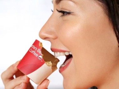 It’s called the “Scoff-ee Cup” and KFC is developing a range of edible cups in conjunction with the launch of Seattle’s Best Coffee in its U.K restaurants. It’s not yet on sale, but KFC says it hopes to bring them to some U.K. stores this year. There are no U.S. plans at this time.