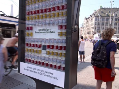 The temperatures have been scorching in the Netherlands, so McDonald’s took advantage of the extreme heat to promote its famous frosty treat the McFlurry with an unusual billboard. The outdoor ad contained 100 McFlurry cups and was connected to a thermometer. The ad was placed in the Dam square on July 4th, and If the temperature surpassed a record 38.6 degrees Celsius (more than 101 degrees Fahrenheit), the billboard would open up, allowing passersby to take the cups, which they could then walk over to the nearest McDonald’s for a free McFlurry.
