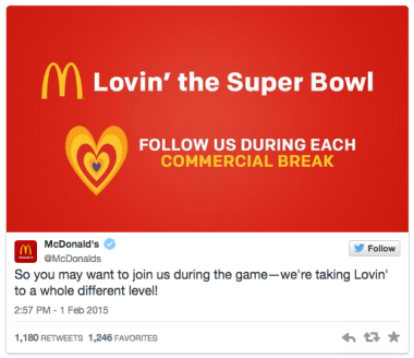 The chain posted tweets about each ad, complimenting the marketer, the ad or its products in some way. McDonald’s then monitored who retweeted each tweet and gave away every product advertised during the Super Bowl, including the big-ticket items like cars.