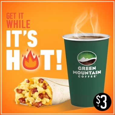 Sonic recently started serving Green Mountain Coffee and a new breakfast promotion has been introduced along with it. The Breakfast Express deal features a breakfast burrito and a Green Mountain Coffee or fountain drink for $3. The deal is available until 10 a.m. and it’s called “Express” because it’s ready in two minutes guaranteed.