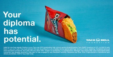 This offer is for participating Taco Bell locations only and applies to all high school seniors that graduate in 2015. All the proof grads need to present is a high school ID and this ad via a smartphone or printout.