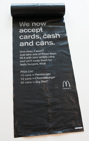 A billboard in Stockholm announced that the McDonald’s would accept “cards, cash and cans.” Attached to it was a roll of black plastic bags, each printed with a custom price list: customers with 10 cans could buy a hamburger, those with 20 could purchase a cheeseburger and big spenders with 40 cans could spring for a Big Mac.